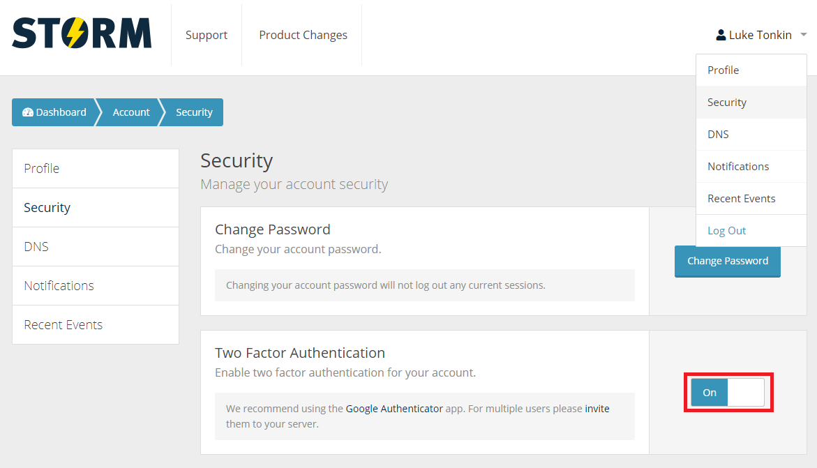 If you haven't enabled it already, Click the toggle button in the Two Factor Authentication section to enable Two Factor Authentication on your account - https://support.nimbushosting.co.uk/support/solutions/articles/36000020520-enabling-two-factor-authentication